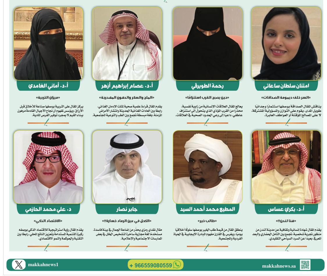 تواصل صحيفة مكة الإلكترونية تقديم نموذج متفرّد في تنوّع مقالات الرأي، حيث تتجاور المقالات الوجدانية مع الطروحات الاجتماعية، والتحليل التربوي مع الرؤية الاقتصادية، في مشهد يعكس ثراء المدرسة الفكرية للصحيفة واتساع أفق كتّابها.