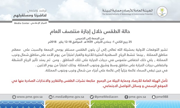 (مكة) – جدة أصدرت الهيئة العامة للأرصاد وحماية البيئة اليوم نشرة , عن حالة الطقس المتوقعة -بمشيئة الله- خلال إجازة…