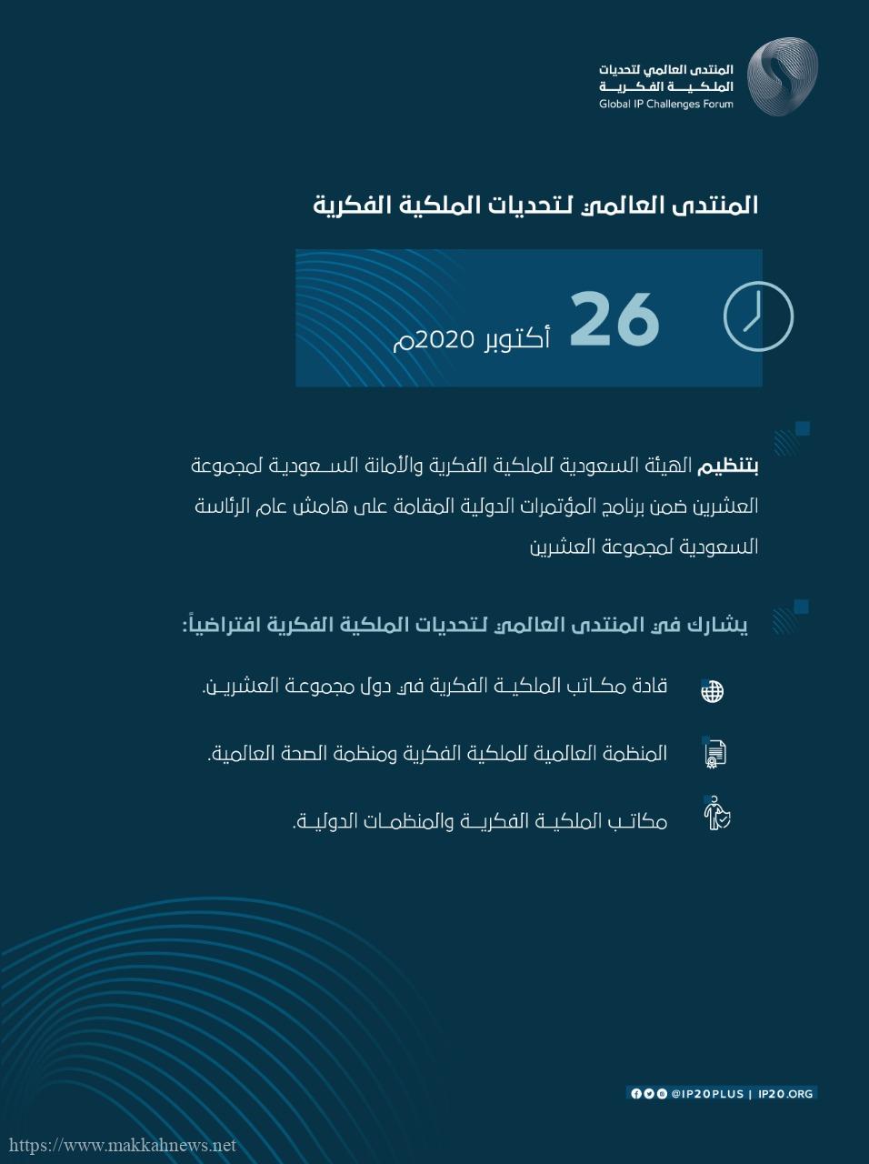 تنظم الهيئة السعودية للملكية الفكرية والأمانة السعودية لمجموعة العشرين المنتدى العالمي لتحديات الملكية الفكرية بتاريخ 9 /3/ 1442هـ الموافق 26/10/2020م…