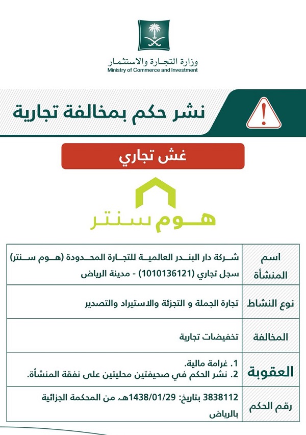 (مكة) – الرياض نشرت وزارة التجارة والاستثمار حكماً قضائياً من المحكمة الجزائية في بالرياض يقضي بفرض غرامة مالية ونشر حكم…