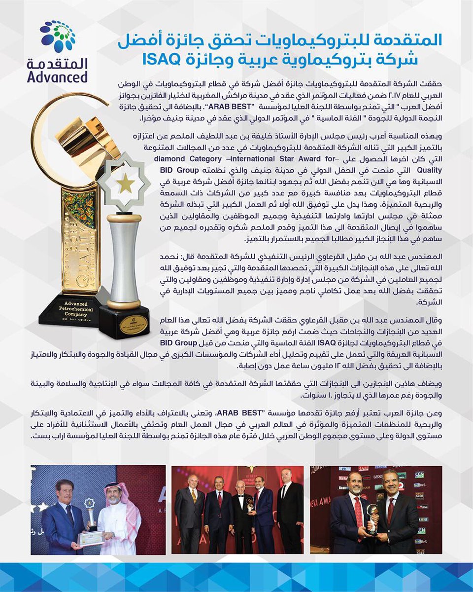 المتقدمة للبتروكيماويات تحقق جائزة أفضل شركة بتروكيماوية عربية وجائزة ISAQ