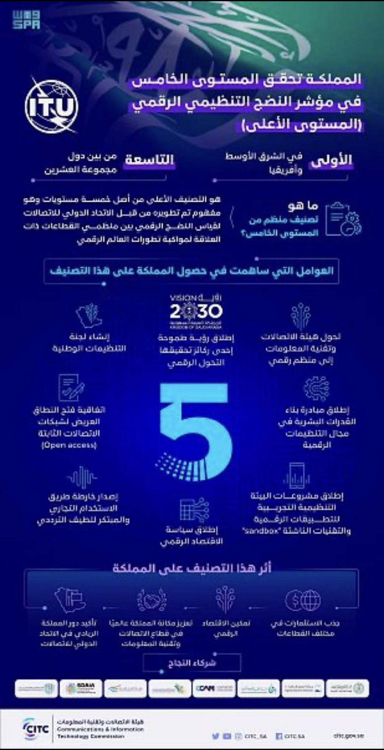 أعلن الاتحاد الدولي للاتصالات عن تصنيف المملكة في أعلى مستويات “مؤشر النضج التنظيمي الرقمي” لمنظمي الاتصالات حول العالم “المستوى الخامس”،…