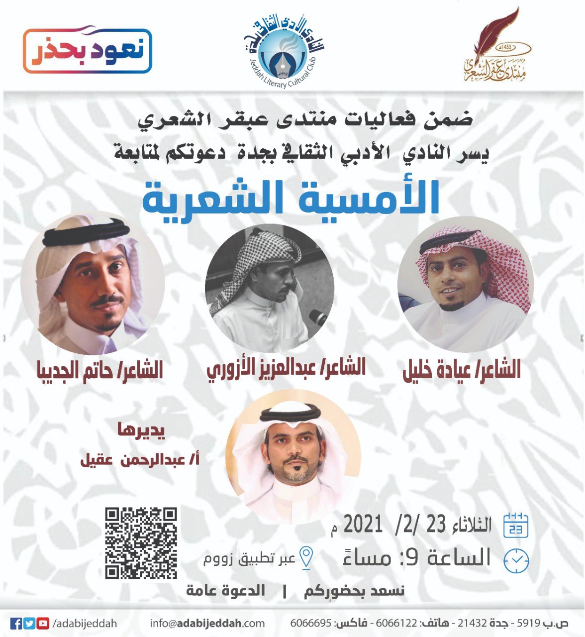 جدة – ينظم النادي الأدبي الثقافي بجدة عبر منتدى عبقر الشعري، غد الثلاثاء 23/2/2021 م أمسية شعرية, لكل من الشاعر عيادة…