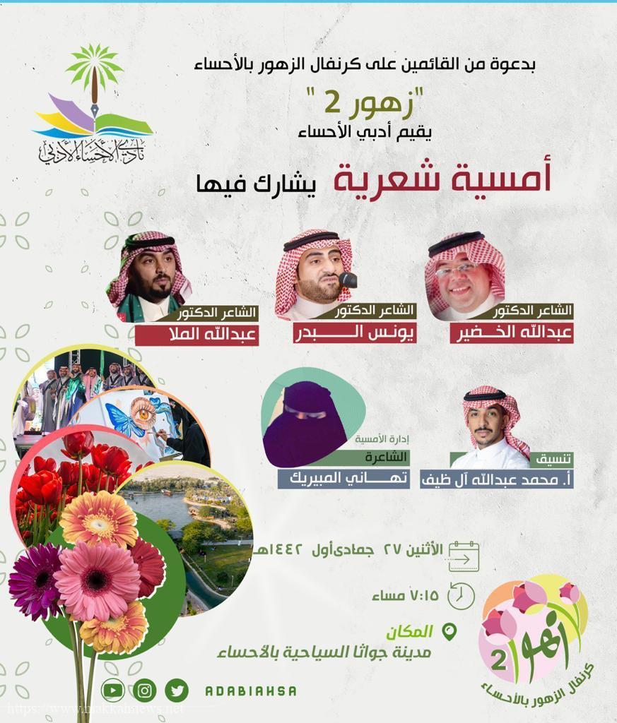 الأحساء: ضمن فعاليات ” زهور ٢” يقيم نادي الأحساء الأدبي في مدينة جواثا السياحية أمسية شعرية مساء الاثنين السابع والعشرين من…