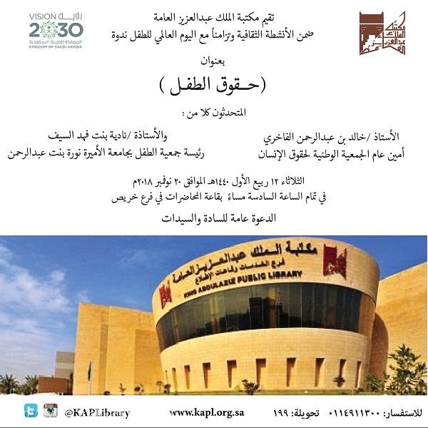 الثلاثاء.. مكتبة الملك عبدالعزيز العامة تقيم ندوة حول “حقوق الطفل”