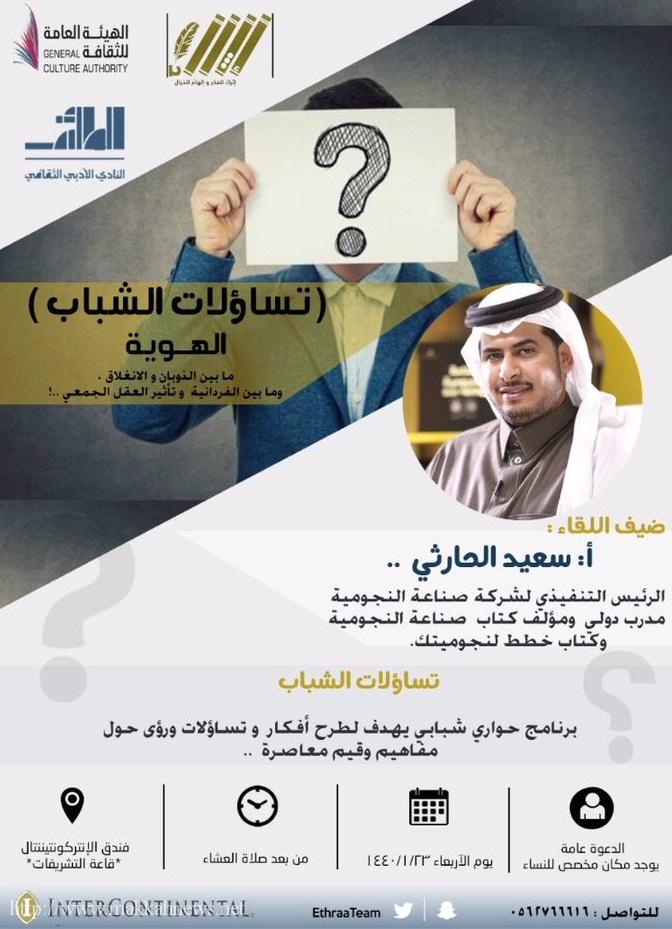 غداً.. هيئة الثقافة وأدبي الطائف ينظمان برنامج “تساؤلات الشباب والهوية”