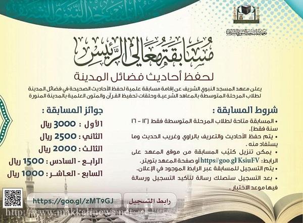“حفظ الأحاديث الصحيحة في فضائل المدينة” مسابقة علمية بمعهد المسجد النبوي