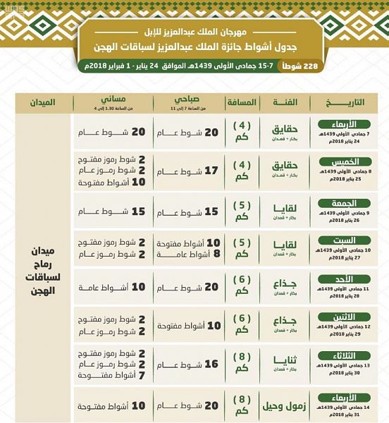 (مكة) – الرياض حددت إدارة مهرجان الملك عبد العزيز للإبل 228 شوطاً وأوقاتها في جائزة الملك عبد العزيز لسباقات الهجن…