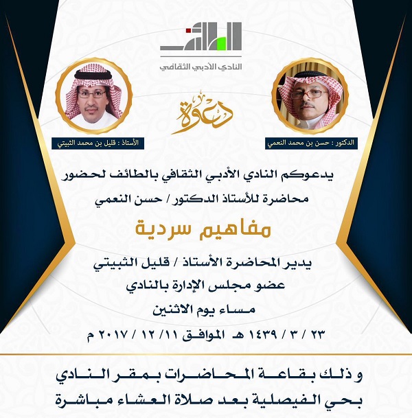 “النعمي” يحاضر عن المفاهيم السردية بأدبي الطائف .. الاثنين