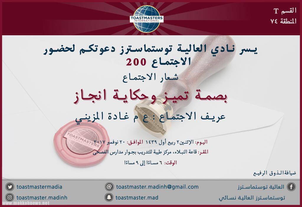 يُقيم نادي العالية توستماسترز إجتماعه “٢٠٠” تحت شعار ” بصمة تميز و حكاية إنجاز ” بالمنطقة “٧٤” بقسمه ”…