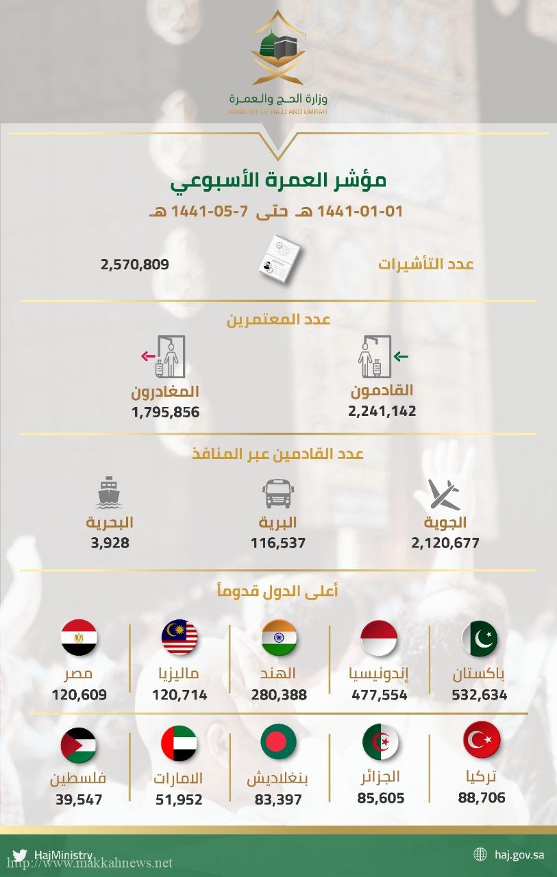 كشفت الإحصاءات الرسمية لمؤشر العمرة الأسبوعي، صدور 2,570,809 تأشيرة عمرة وذلك منذ بدء موسم العمرة لهذا العام في غرة محرم 1441هـ…