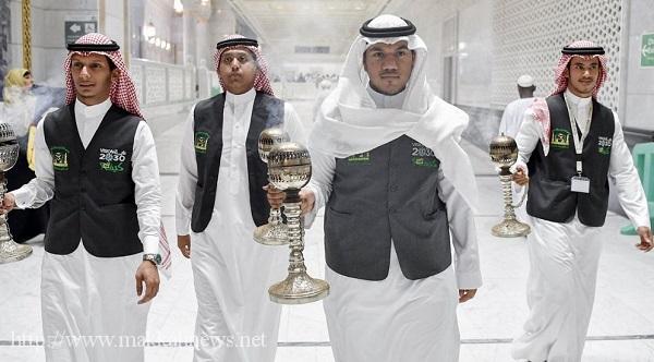 إدارة الأبواب تستقبل الحجاج بالمسجد الحرام بالطيب والبخور