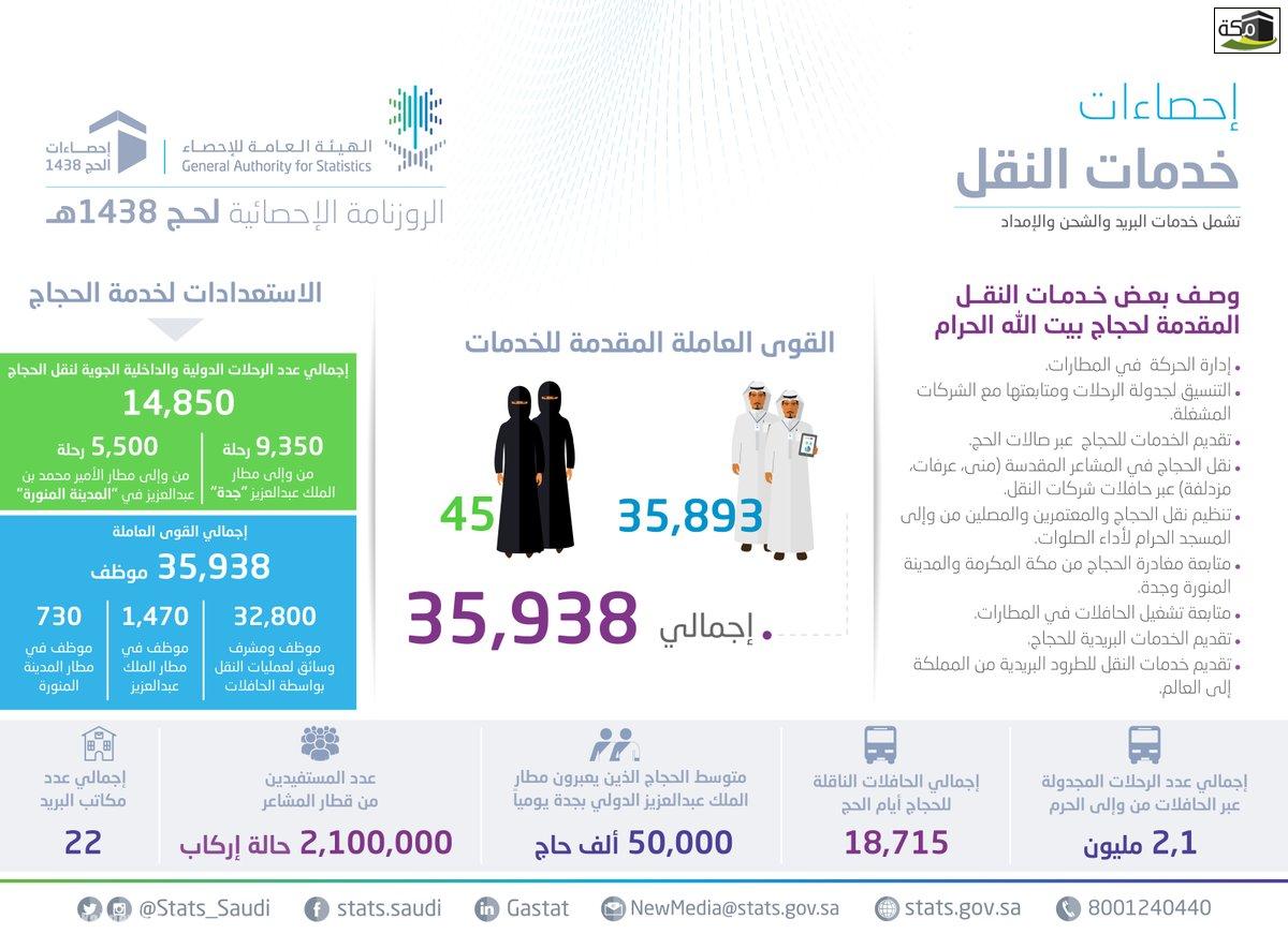 “الإحصاء”: أكثر من 35 ألف موظف يقدمون خدمات النقل والبريد لضيوف الرحمن