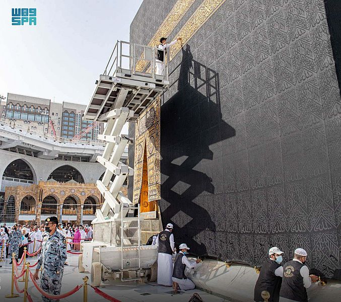 رئاسة شؤون الحرمين تنفذ الصيانة الدورية لثوب الكعبة المشرفة