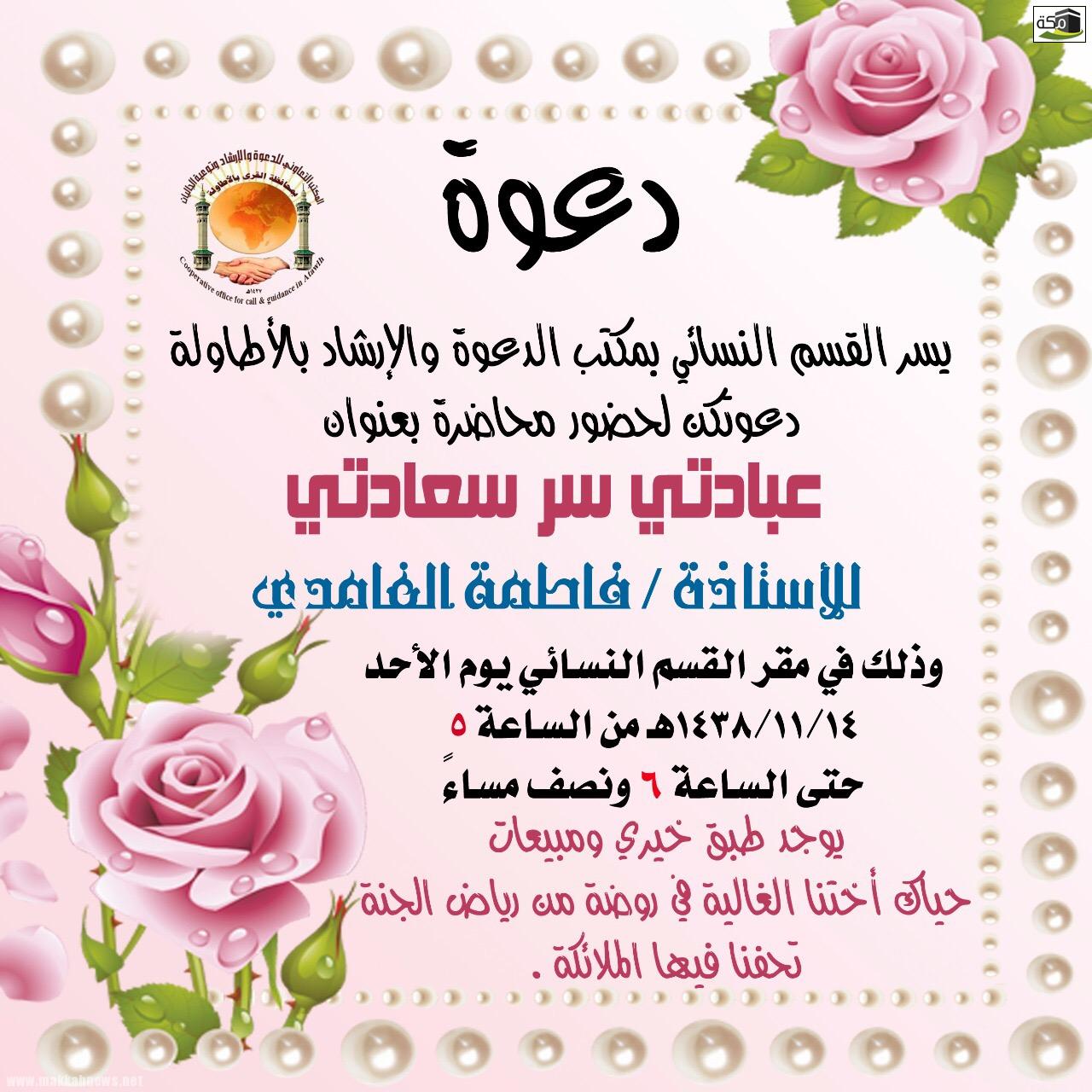 يسر القسم النسائي بمكتب الدعوة و الإرشاد بالأطاولة دعوتكن لحضور محاضرة بعنوان “عبادتي سر سعادتي” للأستاذة ” فاطمة الغامدي”…