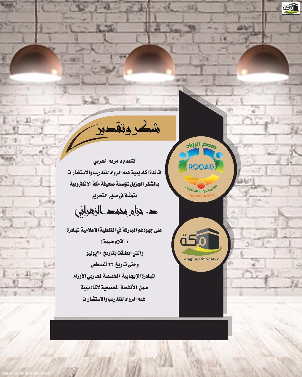 تتقدم د.مريم الحربي قائدة أكاديمية همم الرواد للتدريب والاستشارات بالشكر الجزيل لمؤسسة صحيفة مكة الالكترونية متمثلة في مدير التحرير…