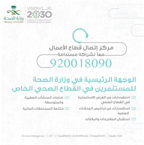 (مكة) – الرياض أعلنت وزارة الصحة عن إطلاق خدمة مركز اتصال قطاع الأعمال على الهاتف رقم (920018090). وأكدت الوزارة أن…