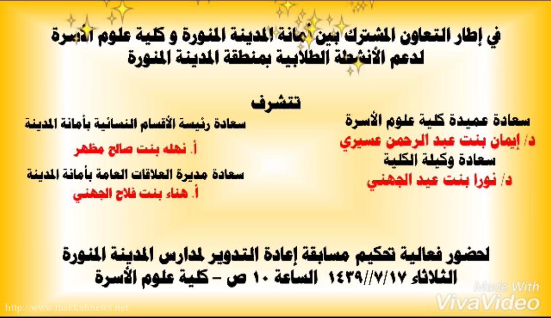 مكة _ شهرزاد الفخراني _ المدينة تختتم يوم غداً الثلاثاء ١٧_رجب _١٤٣٩هـ الساعه العاشرة صباحاً فعاليات تحكيم مسابقة إعادة…
