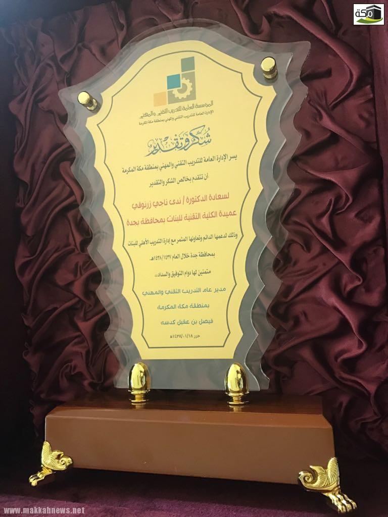 تكريم عميدة الكلية التقنيه بجده لدعمها وتعاونها مع اداره التدريب الأهلي