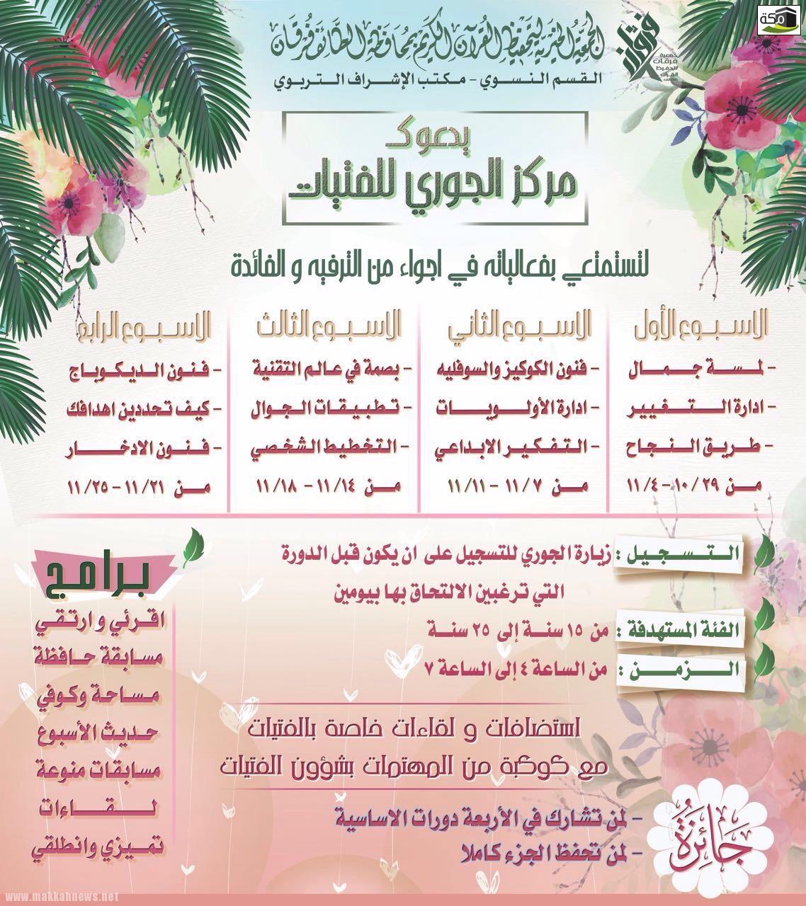 مكة – فاطمة الغانم – الطائف افتتحت جمعية فرقان الخيريه لتحفيظ القرآن الكريم بمحافظة الطائف التابعه لمكتب الاشراف التربوي…