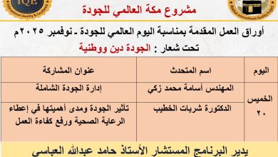 بحضور عدد من المهتمين ، نظمت مؤسسة الجودة والتميز الدولية ومشروع مكة العالمي للجودة، مساء اليوم الخميس 2025/11/20م عدد من…
