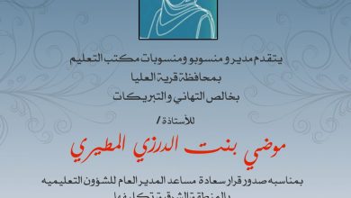 يتقدم مدير ومنسوبو ومنسوبات مكتب التعليم بمحافظة قرية العليا بأصدق التهاني والتبريكات للأستاذة موضي بنت الدرزي المطيري، بمناسبة صدور قرار…