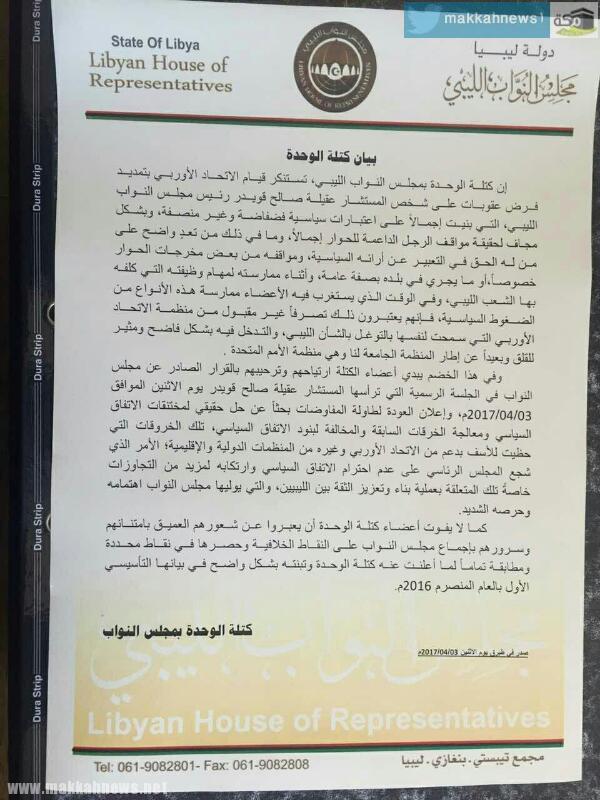بيان كتلة الوحدة تستنكر قيام الإتحاد الأوربي بفرض عقوبات علي المستشار عقيلة صالح قويدر إن كتلة الوحدة بمجلس النواب الليبي