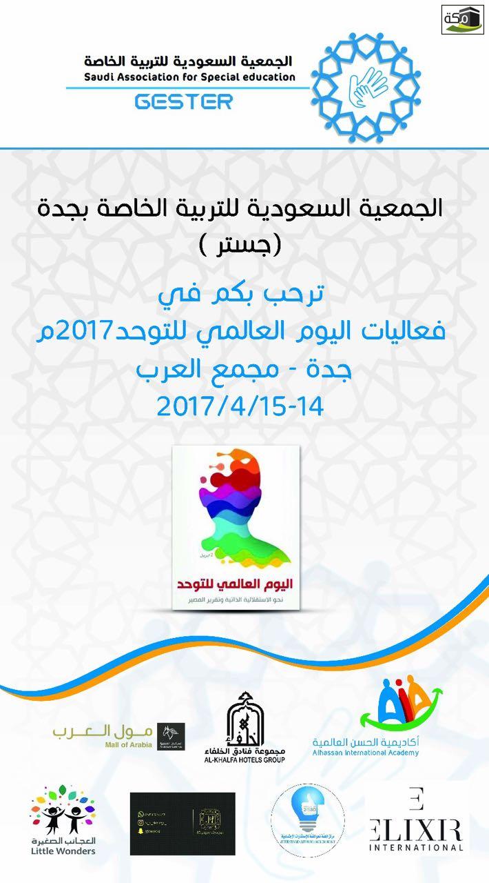 تقيم الجمعية السعودية للتربية الخاصة غداً الجمعة 14/4/ 2017 مهرجاناً بمناسبة اليوم العالمي للتوحد 2017 … بمجمع العرب بجدة…