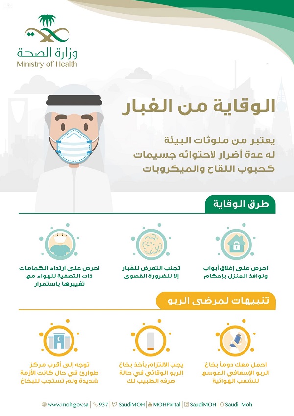 (مكة) – الرياض جدّدت وزارة الصحة دعوتها للمواطنين والمقيمين بضرورة الإلتزام بطرق الوقاية من الغبار وتجنب التعرض له إلا للضرورة…