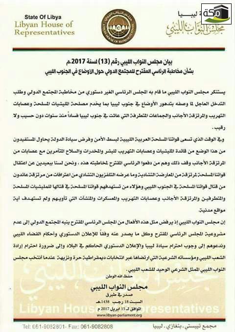 بيان مجلس النواب الليبي رقم (13) لسنة 2017.م